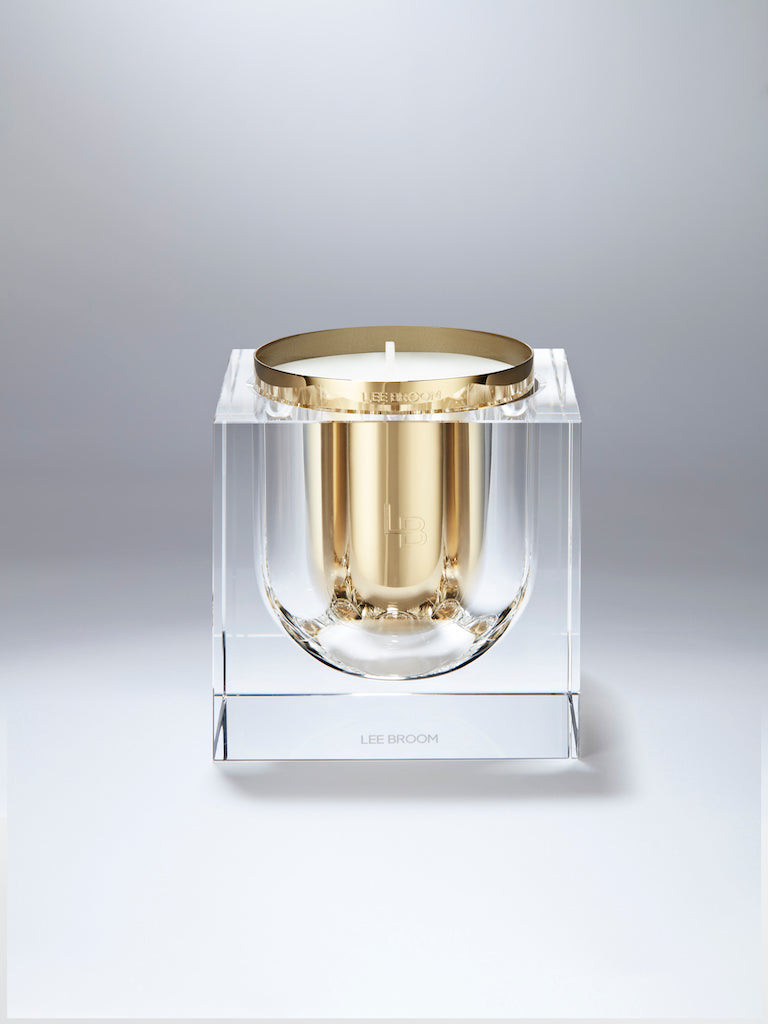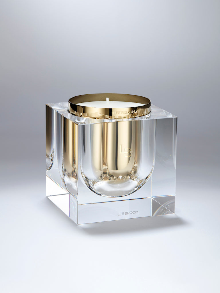 The Lee Broom scented candle comprises of two separate elements that fit seamlessly together. An elegant cubist candle holder, hand-crafted in solid optical crystal and the metal vessel, finished in either polished gunmetal or gold which contains the candle itself. The candle glides smoothly into the crystal’s interior to sit suspended perfectly within. Once the candle is finished, it can then be replaced with a new candle from the range.