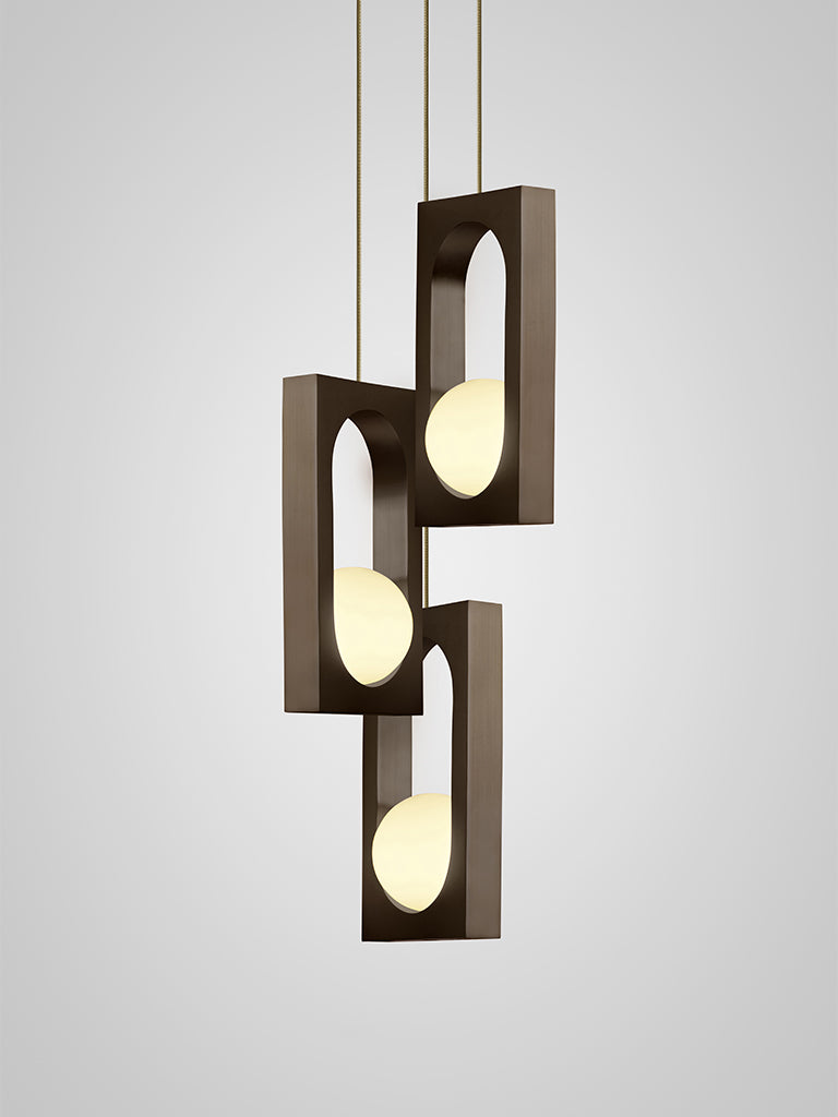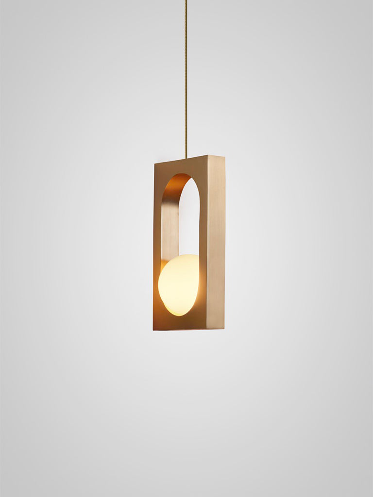 Mythos is a brass pendant light formed of one or two sculptural interconnected links capturing an illuminated glass orb. Mythos Duo is suspended from a hand-stitched leather strap which acts as a sling for the links, concealed connections make it almost impossible to determine how the orb generates its illumination. Mythos is also available as a single pendant suspended by a cord.