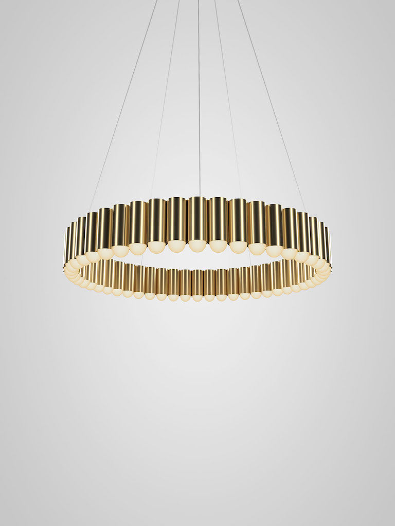 Inspired by the merry-go-round ride of a traditional British fairground, Carousel is a pendant light with a heavyweight presence that floats gently in space. Cylinders of gold, chrome, gunmetal or black each house an inset LED lighting element resulting in a spectacular yet playful ring of light. Carousel is available in 4 sizes, Small, Medium, Large and XL each suspended from a matching finish circular ceiling plate by steel suspension wires with a single clear cable.