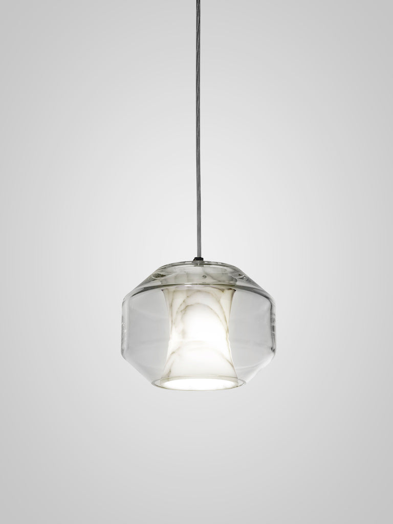 Housing a sculptural Carrara marble diffuser within a lead crystal vessel, Chamber expresses the unexpected translucent qualities of marble in a compelling decorative pendant. With its gentle luminosity and directional downlight, Chamber is available in two sizes & lends itself to being hung in clusters as well as individually.