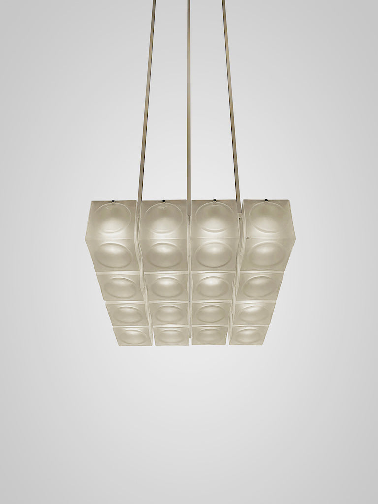 Inspired by the pressed glass bricks often used as an alternative to stained glass in places of worship during the 1970s, Chant is formed of blown glass cubes with a pronounced circular detail in either clear or frosted glass. Constructed in square configurations, the glass cubes connect to form glowing brick-like chandeliers in single or two tiers.