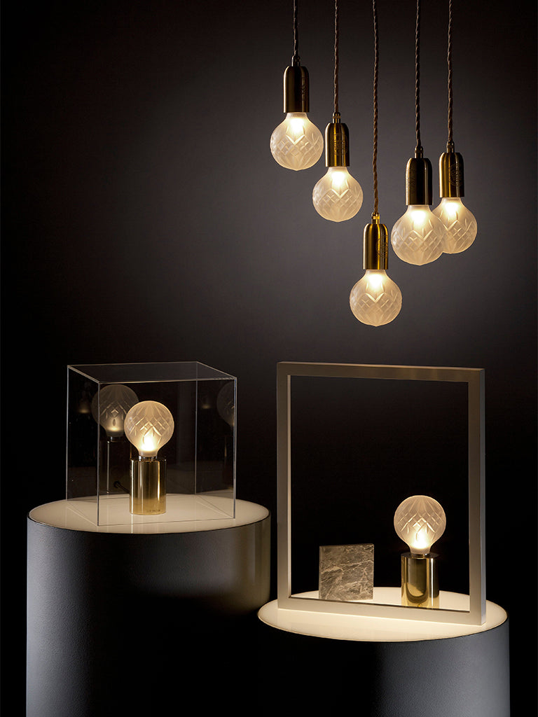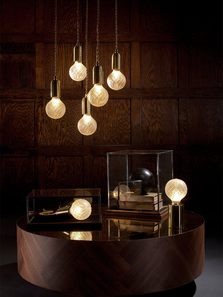 Taking inspiration from the delicate craftsmanship of crystal cutting, Crystal Bulb combines industrial influences with decorative qualities, transforming the everyday light bulb into a beautiful ornamental light fitting. Each lead Crystal Bulb is handcrafted using traditional techniques and hand cut with a classic crystal pattern inspired by those found on traditional whiskey glasses and decanters.
