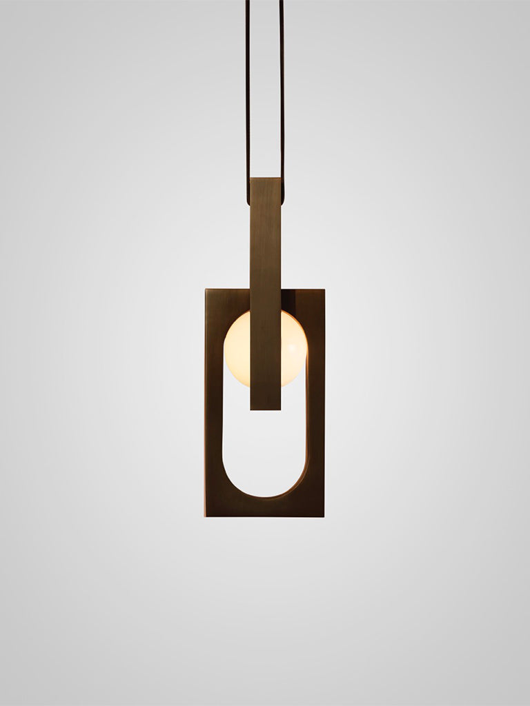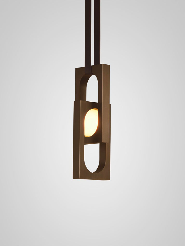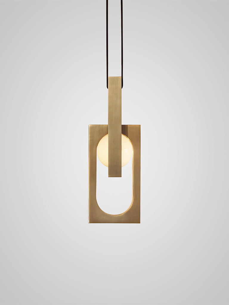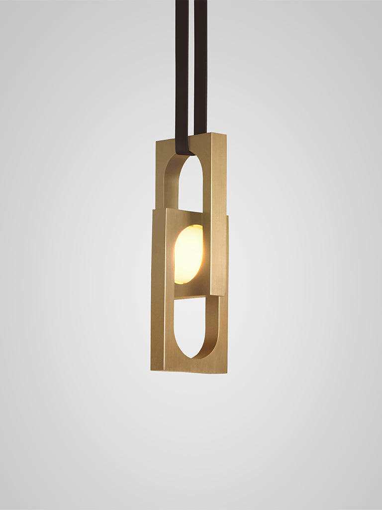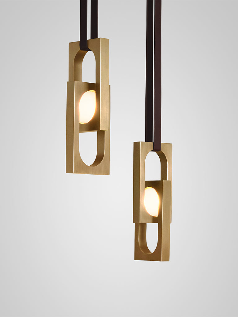 Mythos is a brass pendant light formed of one or two sculptural interconnected links capturing an illuminated glass orb. Mythos Duo is suspended from a hand-stitched leather strap which acts as a sling for the links, concealed connections make it almost impossible to determine how the orb generates its illumination. Mythos is also available as a single pendant suspended by a cord.