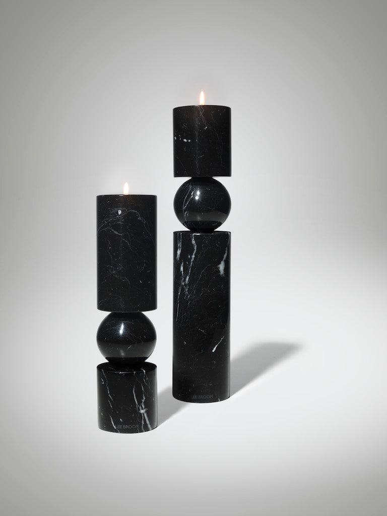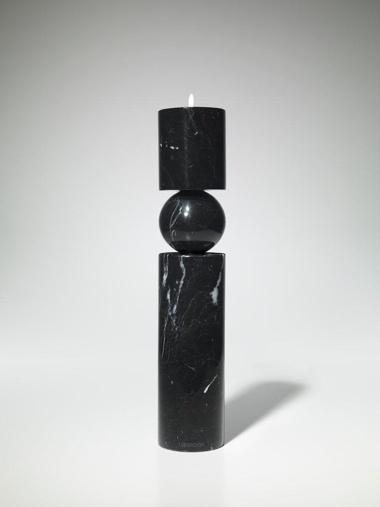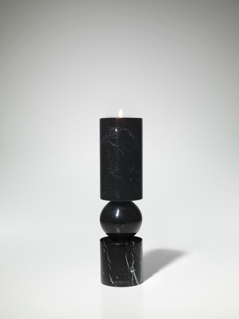 A play on the concept of pivots and supports, Fulcrum is a sculptural and monolithic candlestick whose cylindrical stem appears to balance on a central sphere.