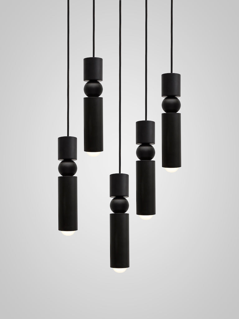 The Fulcrum Chandelier features five Fulcrum Lights suspended at set lengths from a matching finish ceiling plate and creates a dramatic cluster that is simple to install.