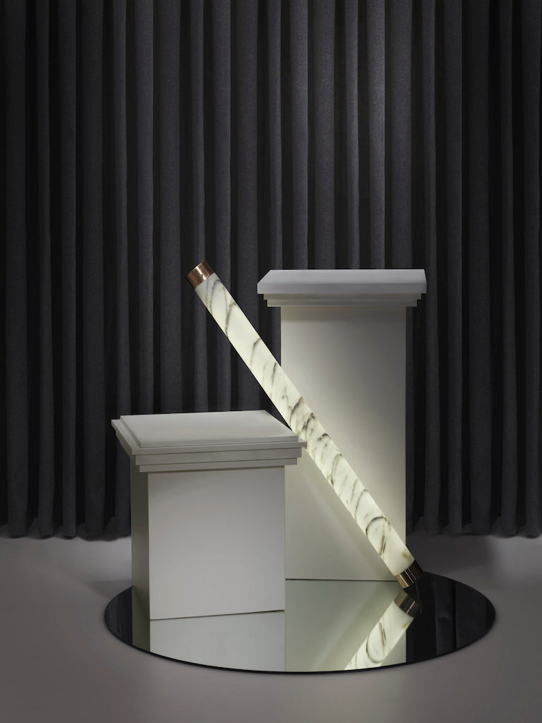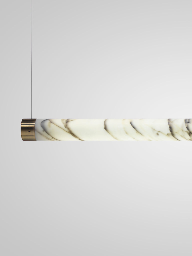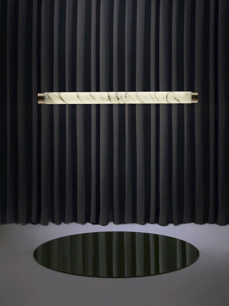 Skillfully milled from a single piece of Carrara marble and finished at each end with brass or chrome bands, Tube contains a strip of LED bulbs resulting in what appears to be a solid length of warm glowing stone. The unique veins of each piece of marble mean no two lights are exactly the same. A handcrafted twist on the traditional fluorescent tubelight.